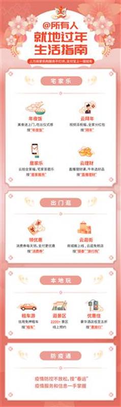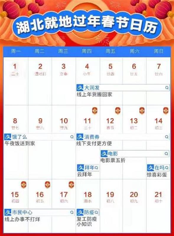 从湖北就地过年春节日历可以看出,用户只要上支付宝搜索,就能获得相应的数字化服务。全国已有包括2200家景区、400家市民中心、50家出行公司等上万服务方春节线上营业,联合支付宝针对返乡、宅家及本地出游三类人群,推出防疫包、居家乐、云拜年、云逛街、云理财、云办事、优惠住、分时游、免押租等九大类“就地过年”服务保障。