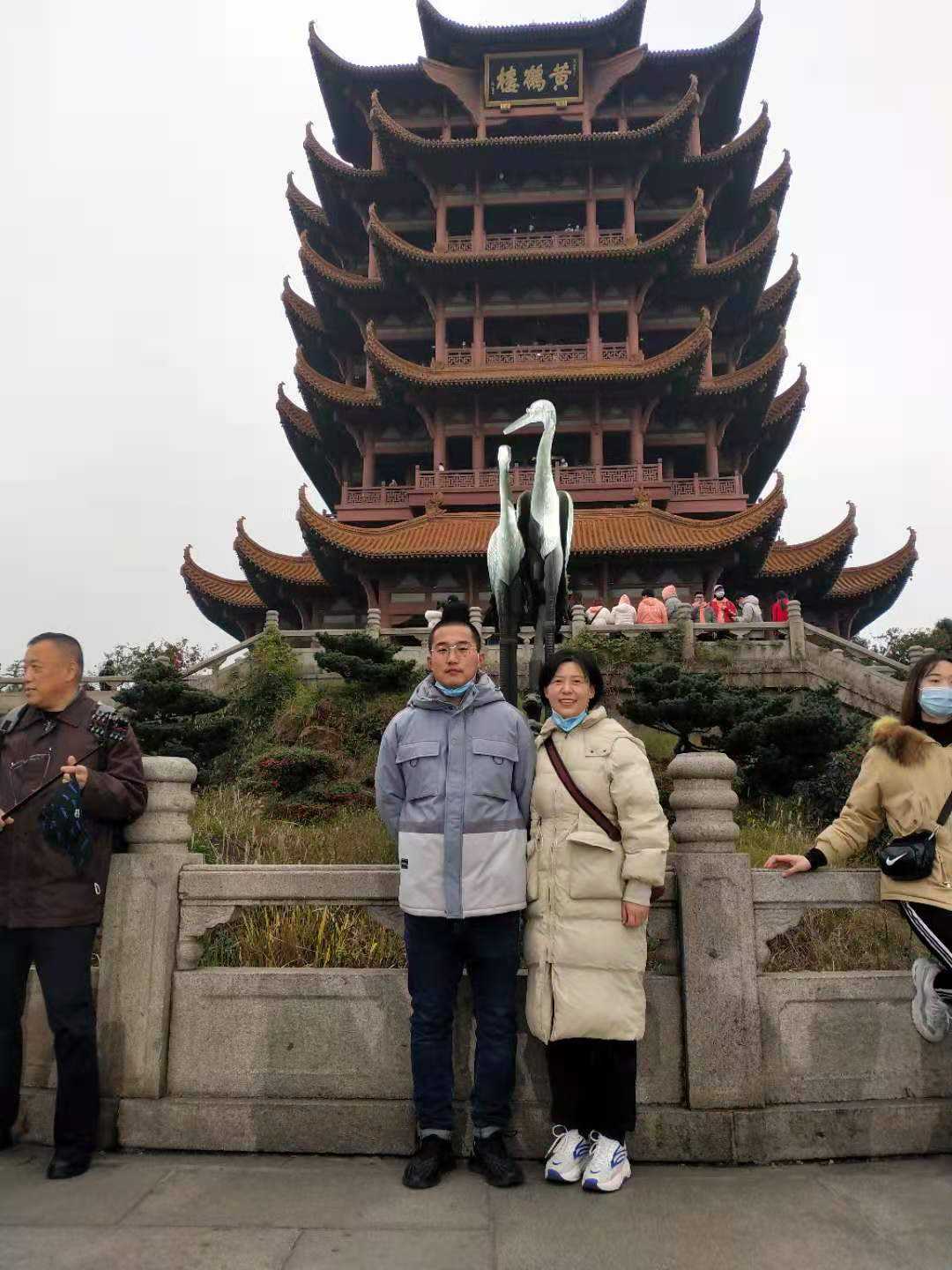 2020年12月3日,宫达飞带妻子再次来到武汉,在黄鹤楼前合影。本人提供