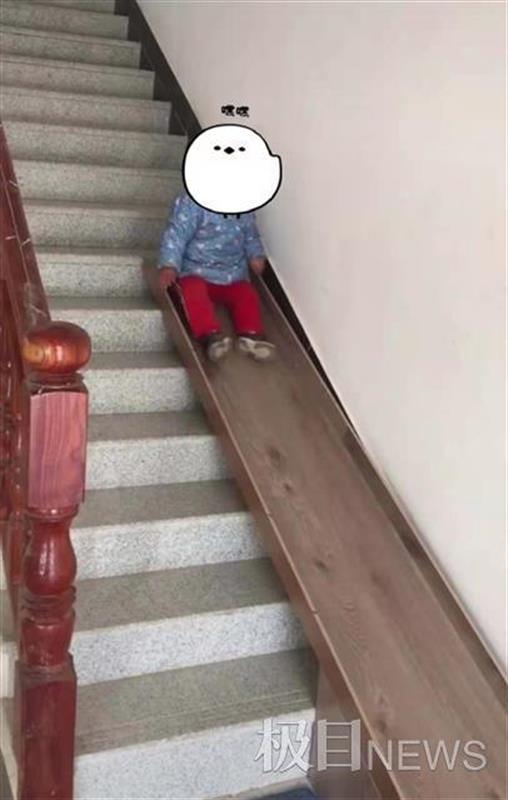 田先生向极目新闻记者介绍,他今年30岁,做过木工。而家里的房子属于自建房,共有4层,滑梯便位于1、2层之间。田先生的儿子今年3岁了,为了让儿子在家里和户外能一样快乐,去年年初,田先生根据楼梯的角度,利用家里多余的木板做成了这样一个滑梯,材质为密度纤维,长2.7米,宽0.4米。一年来,孩子玩滑梯时依然很开心。
