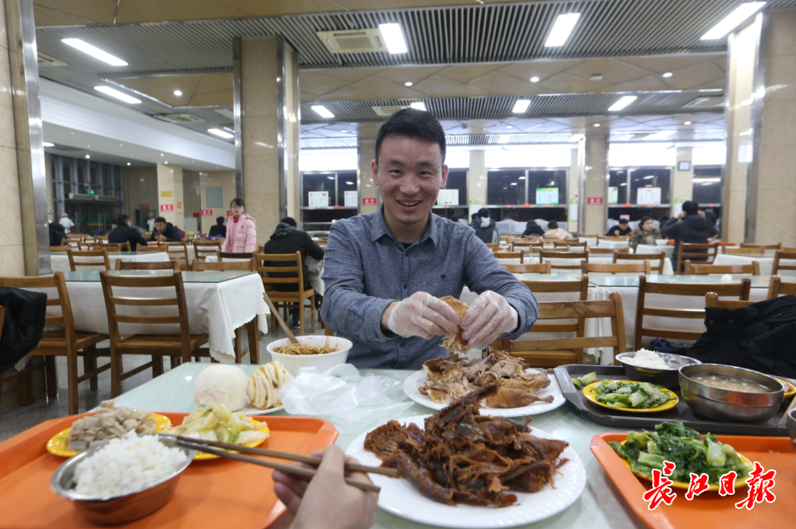 长江网2月9日讯2月8日晚,在华中农业大学竹苑食堂,园艺林学学院的博士研究生孙权带着家乡山东德州邮寄过来的德州扒鸡,与一起留在武汉就地过年的同学们分享家乡的味道。据介绍,孙权因为课题研究今年不能回家过年,家人为这位第一次离家过年的博士生专门做了6只扒鸡邮寄到学校,让他春节期间能吃到家乡的味道。(记者杨涛 通讯员蒋朝常 摄影报道)