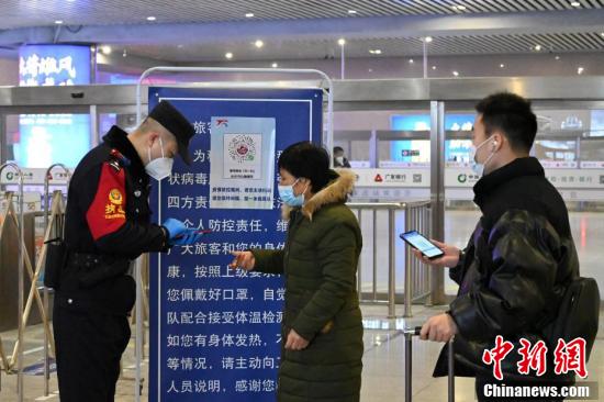 2月9日,河北石家庄火车站出站处,警务人员查验旅客的健康码。