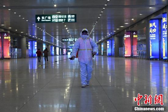2月9日,河北石家庄火车站出站大厅,工作人员正在进行消杀工作。