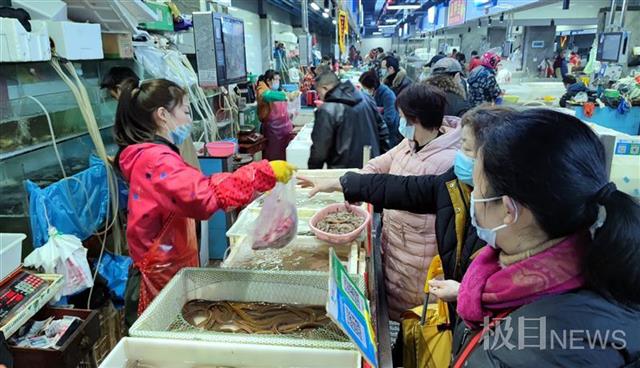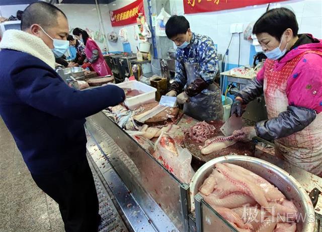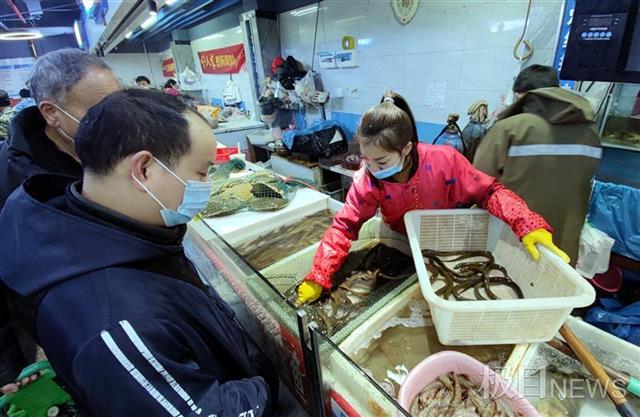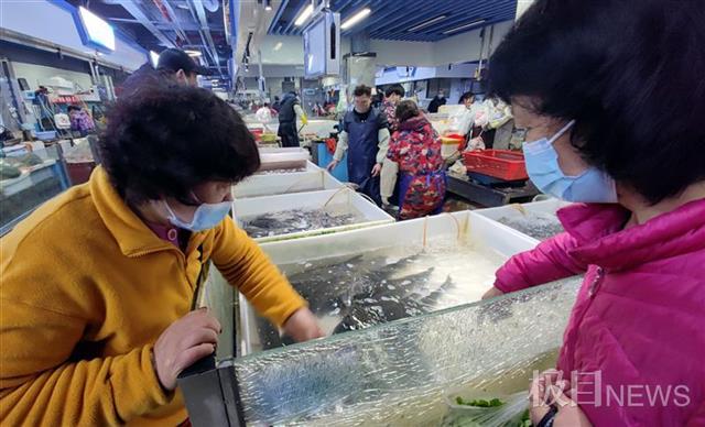 2月9日,在武汉光谷立信生鲜市场,不少市民发现水产区的活鱼、活虾、甲鱼等水产品和平时一样丰富多样,价格也还算稳定。