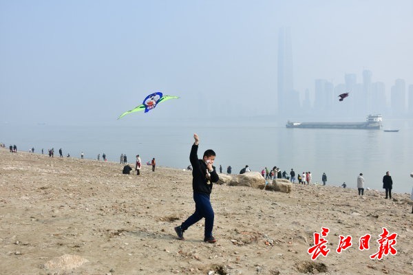 2月12日,大年初一,市民在汉口江滩放风筝。记者詹松 摄