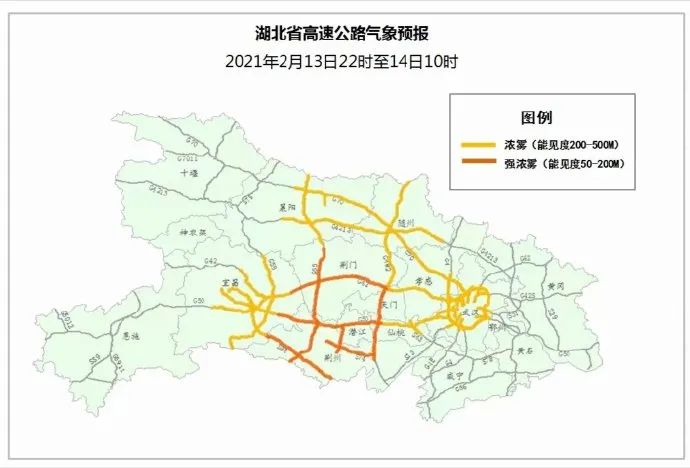 据湖北高速交警:预计今天早晨,武汉、荆州、荆门、随州、宜昌、襄阳、孝感、天门、仙桃等地区高速路段将出现能见度小于500米、局部小于200米的大雾天气,荆州、荆门等地部分高速路段可能出现能见度小于200米,局部小于50米的强浓雾。