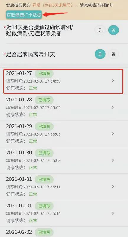4、填写健康档案单。可点击“获取健康打卡数据”按钮,读取武大日报平安的本人每日健康打卡数据(提示:打卡后到可以在此处获取打卡数据有一定延时)。
