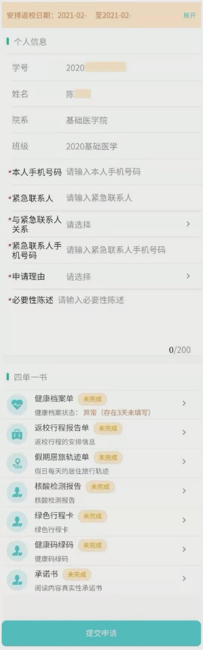 3、填写返校申请表。填写基本信息以及申请表底部相关信息。