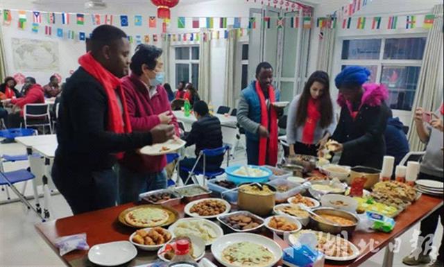 随着春节联欢晚会开始,留学生们带上家乡的特色美食:也门的抓饭KABSA、加蓬的木薯叶贝壳、尼泊尔的CHICKEN CURRY,还有披萨、炸鸡、咖喱牛肉等,他们戴上学校为其准备的红色围巾在活动室欢聚一堂,看晚会,享美食。当晚会逐步推向高潮,同学们按捺不住激动的心情,放声歌唱,表达对世界各国同学和朋友们的思念与祝福。很多留学生在自己国家通过线上直播间参与了活动互动,期待能早日回到校园。