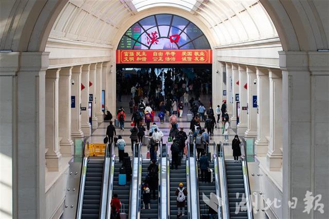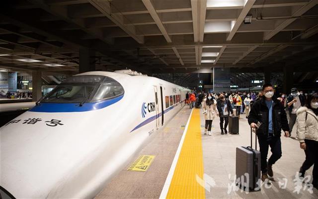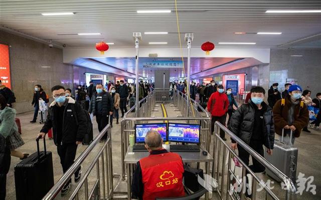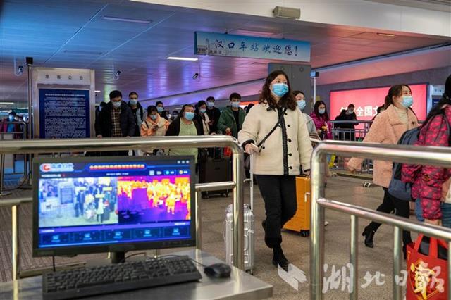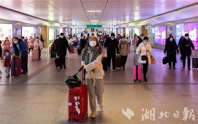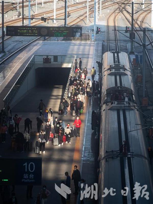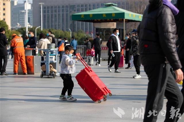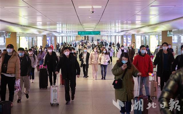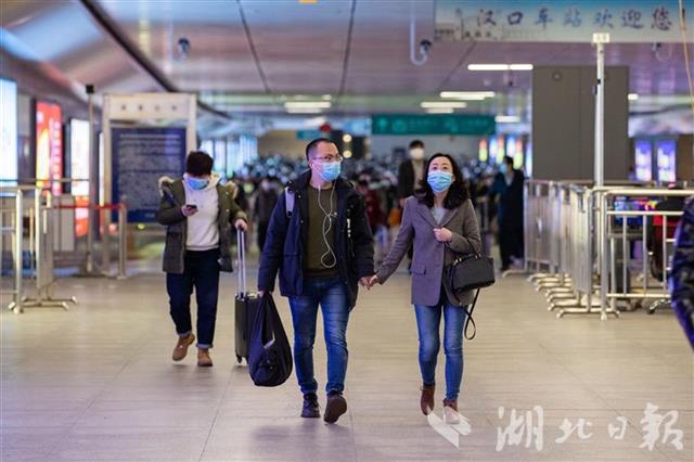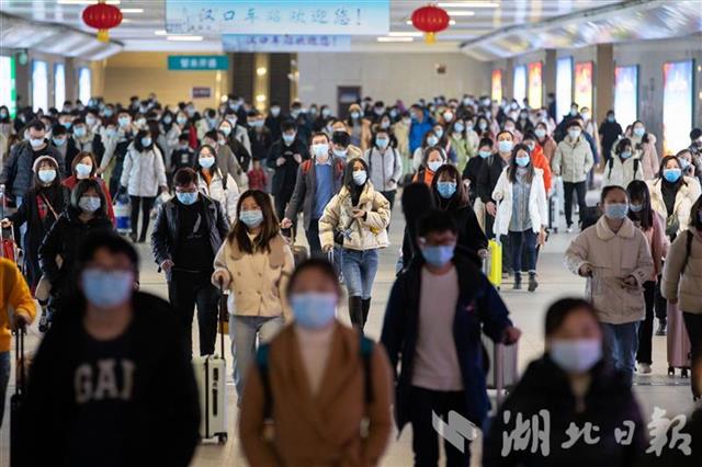 2021年2月17日,旅客抵达武汉市汉口火车站。随着春节假期接近尾声,武汉市汉口火车站迎来客流高峰。汉口火车站严格采取车站通风换气、卫生保洁、日常消毒等卫生管理措施,加强旅客扫描健康码、测体温、保持安全间距等防疫工作,确保旅客出行安全。