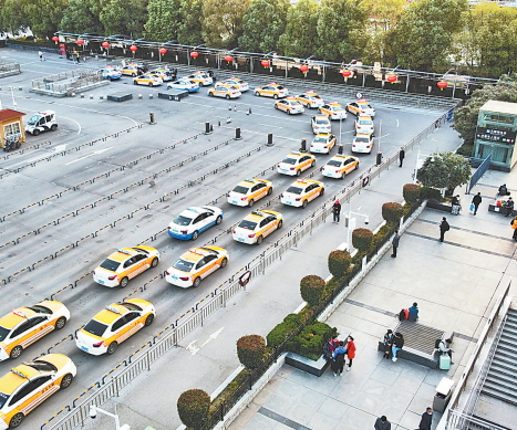 2月17日(初六)下午5时,汉口火车站站前广场,上百辆出租车陆续排队进站等候乘客上车。据现场广场综治办工作人员介绍,当日回城的旅客多为省内打工者和大学生。