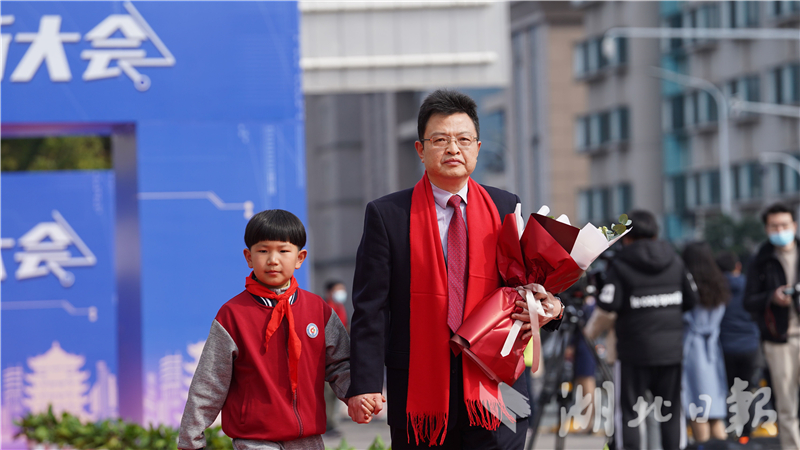 图为:2月18日,湖北省科技创新大会上,李建成(右)走上红毯。(湖北日报全媒记者 鲁腾 摄)