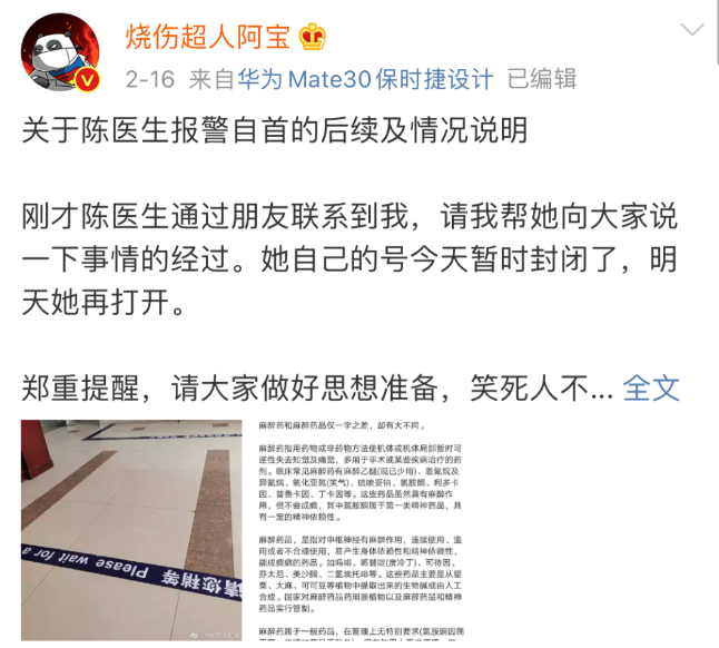 2月16日15时许,@妇产科的陈大夫 通过健康博主@烧伤超人阿宝发布《关于陈医生报警自首的后续及情况说明》,介绍了其购买七氟烷的原因和渠道。