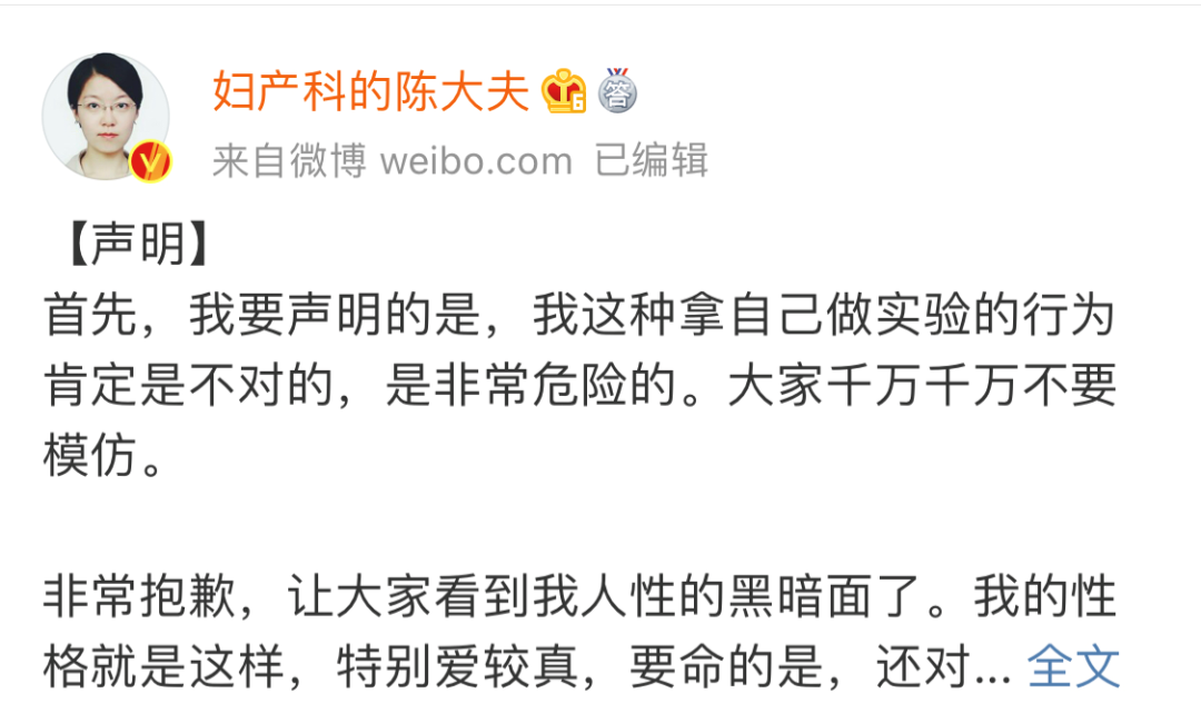 2月16日,陈大夫发布一则她用七氟烷做实验,将自己捂晕的视频,目前相关内容已删除。