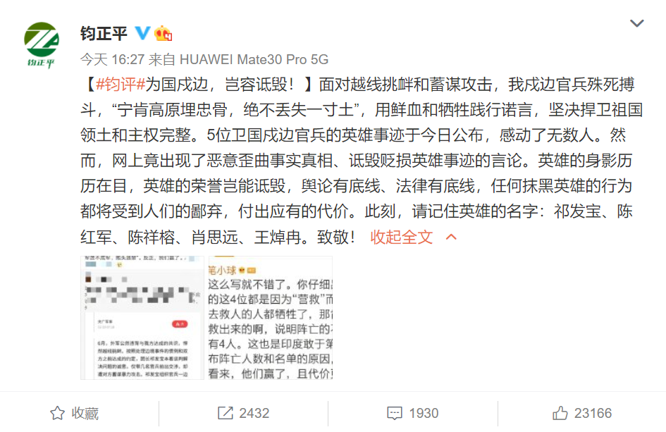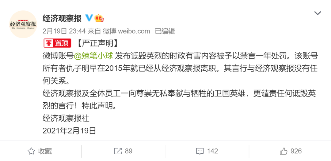 深夜,经济观察报社发布严正声明称,账号@辣笔小球 所有者仇子明早在2015年就已经从经济观察报离职。其言行与经济观察报没有任何关系。经济观察报及全体员工一向尊崇无私奉献与牺牲的卫国英雄,更谴责任何诋毁英烈的言行!特此声明。