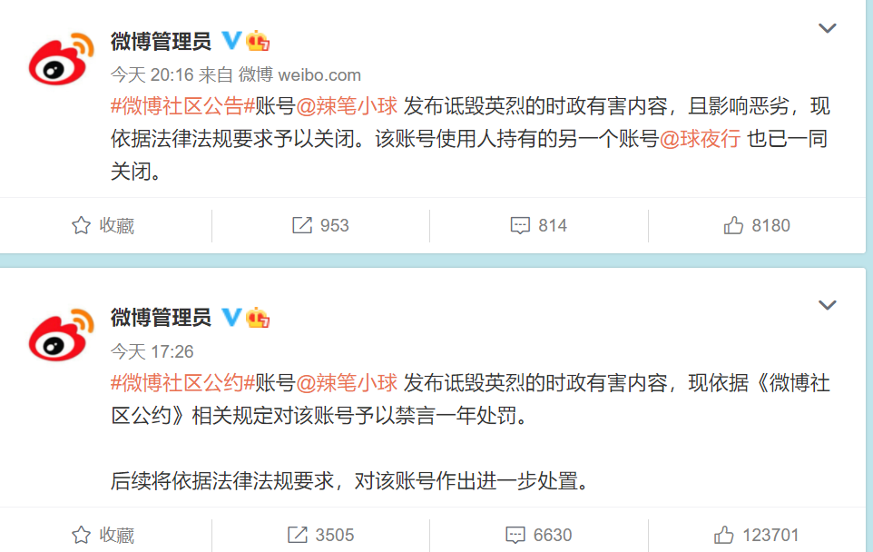 昨晚,微博管理员发布公告称,账号@辣笔小球 发布诋毁英烈的时政有害内容,且影响恶劣,现依据法律法规要求予以关闭。该账号使用人持有的另一个账号@球夜行 也已一同关闭。