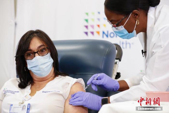 资料图:2020年12月14日,纽约长岛犹太医疗中心护士史蒂芬妮接种新冠疫苗。 中新社记者 廖攀 摄