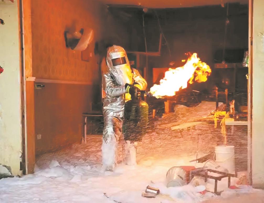 指挥员立即下令三名消防救援人员铺设水带,出动泡沫水枪对还在燃烧的厨房进行灭火作业,防止火势蔓延。在灭火的过程中,消防救援人员听到屋内有煤气罐喷火发出的声响。消防救援人员彭杰在泡沫水枪的掩护下,三进三出将厨房内两个冒着火舌漏气的煤气罐和1个没有燃烧的小煤气罐拎了出来,三颗“定时炸弹”成功解除。