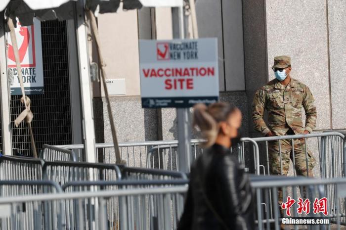 当地时间2月5日,国民警卫队士兵驻守纽约洋基球场新冠疫苗接种点。当日,纽约洋基球场作为新冠疫苗大规模接种点启用。中新社记者 廖攀 摄