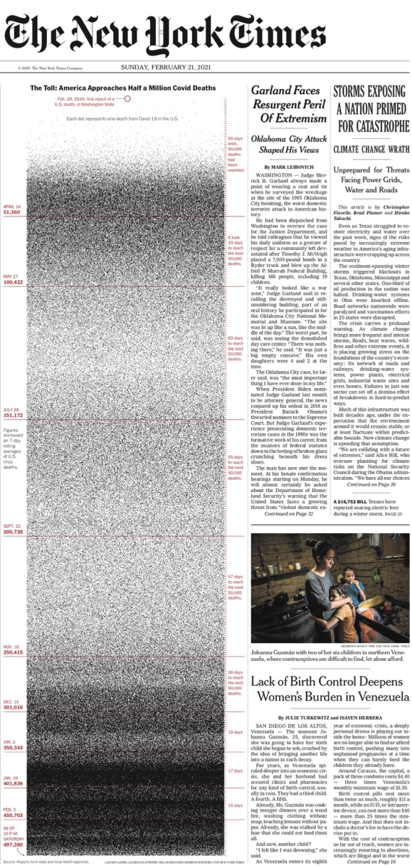 中新网2月22日电 综合报道,当地时间21日,美国《纽约时报》头版以巨幅点状图揭示了全美新冠疫情灾难:图表时间轴上,一个点代表一个因新冠病毒在美国逝去的生命,从2020年2月29日报告第1个死亡病例迄今,已累计有近50万个死亡病例。