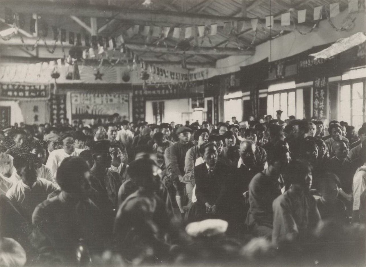 第二张照片中的房顶为中国传统木梁、人字结构屋顶,木梁上挂满了彩旗和灯笼,四周墙面贴满标语和宣传画,后墙正中有一大幅宣传画和放着光芒的五角星。代表们面向主席台密密麻麻坐满了会场,窗边还有代表站立,他们神情庄重、聚精会神,不同的穿着反映代表来自各个阶层,具有明显时代烙印。