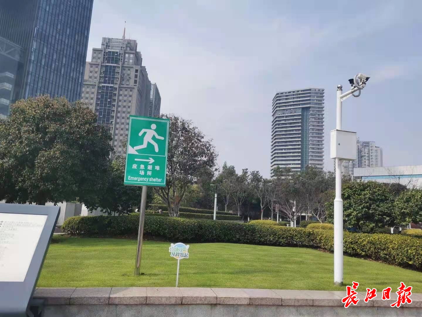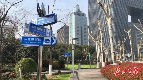 洪山广场内应急避难场所标识标牌。记者李慧紫 摄