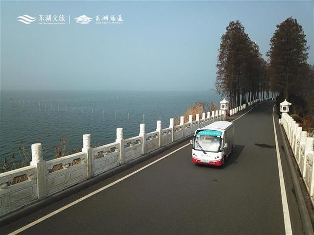 绿道观光车赏樱专线,可以直达东湖樱花园。游客从湖光序曲、白马洲头、落霞归雁三大东湖绿道门户站点可乘车直达樱园临近站点“全景广场站”,单线往返仅需30元/人,玩转东湖,省心省力。