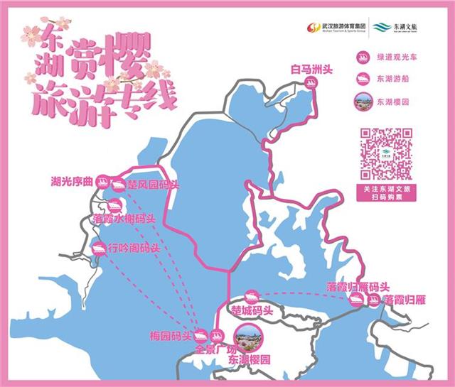 东湖游船赏樱专线,水路直达不拥堵。东湖游船推出水路赏樱专线,六大码头串联起听涛、磨山、落雁三大景区,游客从楚风园码头、落霞水榭码头、行吟阁码头、落霞归雁码头均可登船直达临近樱园的梅园码头和楚城码头,畅快赏樱、惬意游湖。
