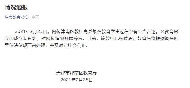 根据天津市津南区教育局通报,2月25日,网传津南区教师肖某某在教育学生过程中有不当言论。津南区教育局立即成立调查组,对网传情况开展核查。