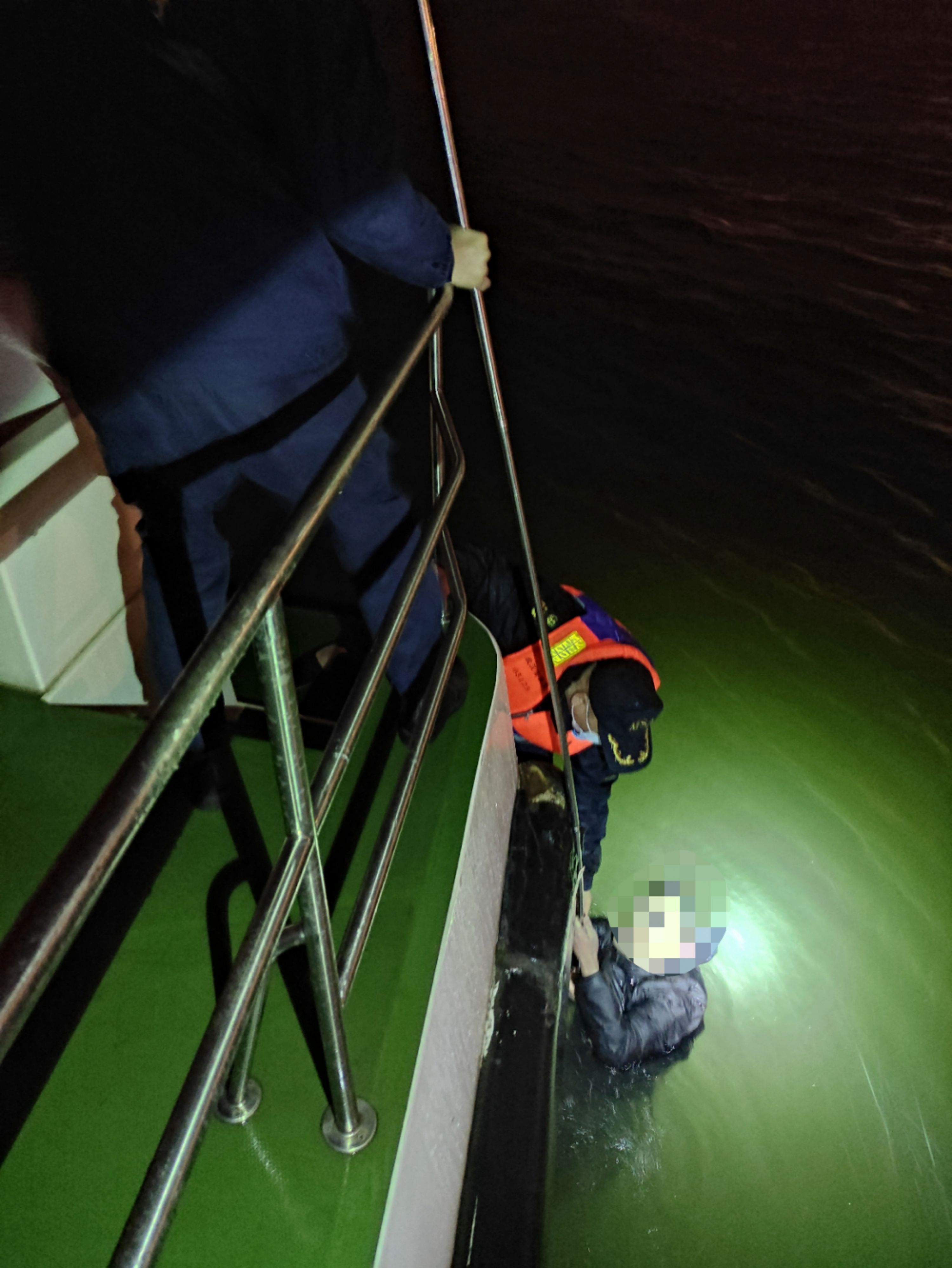 3时02分,接警17分钟之后,海事执法人员合力将落水者救起。执法人员为其提供毛毯、热水等,观察其精神状态并安抚稳定其情绪。