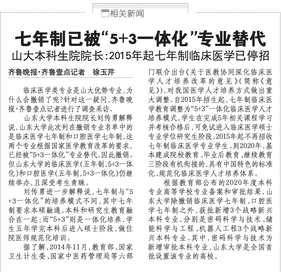 据齐鲁晚报报道,记者就山东大学临床医学七年制被撤销,采访了山东大学本科生院院长刘传勇。
