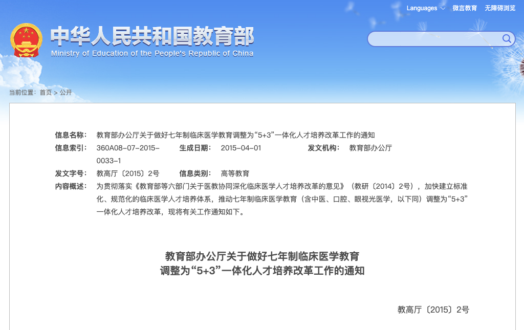 2015 年 3 月,教育部下发《关于做好七年制临床医学教育调整为“5+3”一体化人才培养改革工作的通知》,要求全国各医学院校从 2015 年起停止招收七年制学生。