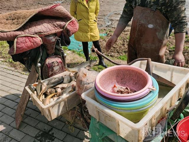 记者准备离去时,一名坐在岸上与周围人谈笑的男子引起记者注意。该男子刚抓完鱼不久,他将鱼倒在身旁的地面上,其中有鲫鱼、鲤鱼、黄颡鱼等品种。有几条鱼时不时拍打着鱼尾,地面的泥浆随之向四周喷溅,围观者只好边笑边连连后退。