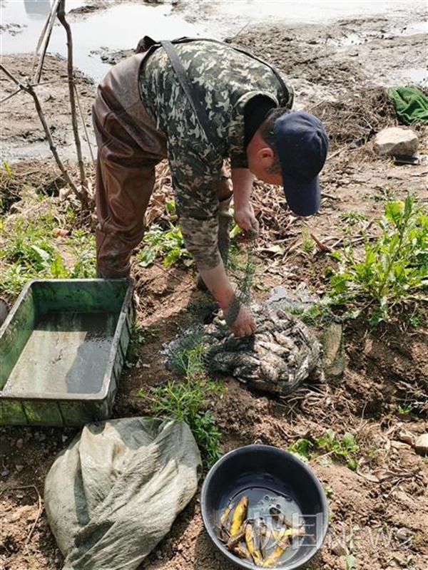 该男子说,他听说这里可以抓鱼,便和朋友一起来到这里。在二人身旁停着一辆电动车,电动车脚踏板上放有一筐已被洗净的鱼,后座放有几个菜篮、塑料盆、塑料筐,还有渔网袋。该男子称,湖水被抽干后,留在湖里的鱼不久便会死掉,他感觉有些可惜,便和朋友一起过来抓鱼。