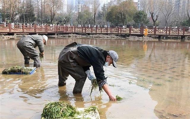 关山公园管理处介绍,该植物名叫矮化苦草,是人工湖水生态改造公益项目的一项重要举措,由洪山区关山街道商会于2月捐资栽种,旨在提升水质。