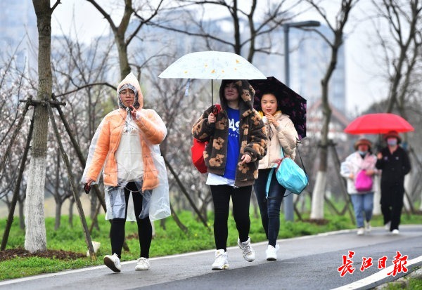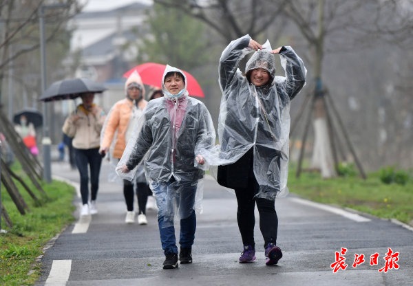 长江网3月8日讯 2021年3月8日上午,多家企事业单位在金银湖绿道开展环金银湖徒步活动,在和风细雨中,以赏花观景健步行的方式度过三八妇女节。在步行的人群中,不乏陪游的男同胞。他们的任务,主要是打旗开道,一路护驾,为“女神”们服务。(记者喻志勇 摄影报道)