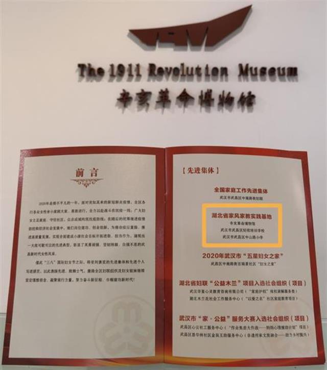 在此活动中,该馆被授予“湖北省家风家教实践基地”,此基地旨在牢牢把握立德树人根本任务,坚持宣传社会主义核心价值观,弘扬中华民族传统家风家教家训优秀文化,积极开展家风家教教育工作,构建家校社协同育人格局。