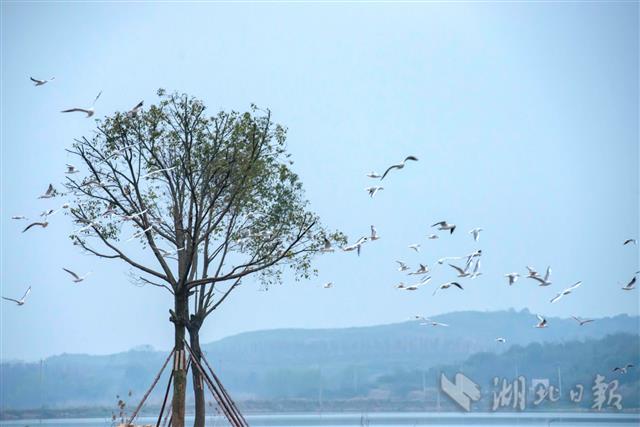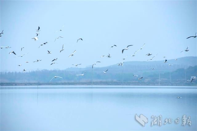 3月9日,在鄂州市东沟镇大桥村湖堤处,上千只红嘴鸥或在空中盘旋,或从水面掠过,引来众多游客围观。近年来,大桥村依托得天独厚的生态资源优势,大力发展乡村旅游,在打造网红景点的同时,也注重生态环境的保护,吸引了大量迁徙候鸟在此歇息。(视界网 胡战军 摄)