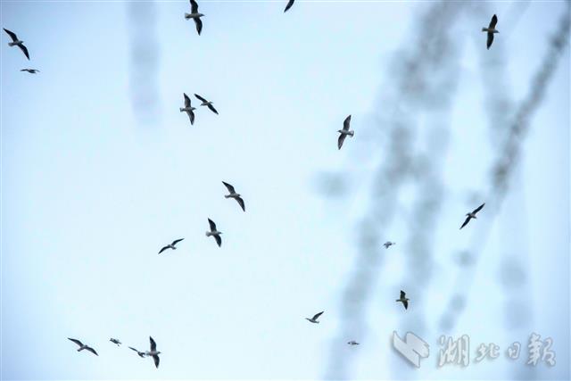 3月9日,在鄂州市东沟镇大桥村湖堤处,上千只红嘴鸥或在空中盘旋,或从水面掠过,引来众多游客围观。