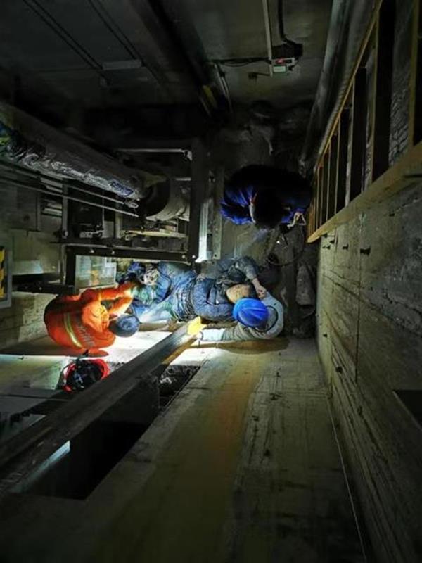 消防员一赶到现场,一群工人就赶忙迎上来介绍情况。据了解,发生事故的现场为在建工地电梯井处,坠井工人从事大楼后期装修工作,早上他等电梯时,靠在电梯门上,突然电梯门直接打开,其直接从一层掉落至负二层电梯井的缓冲层,随即失去意识,情况十分危急。