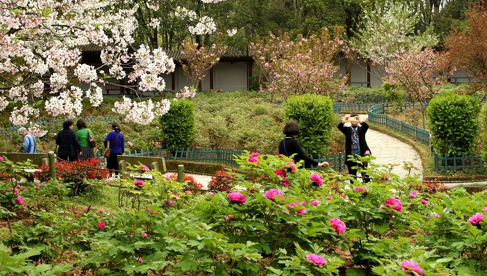 在植物配置上,东湖牡丹园讲究开花时间上的搭配、空间上的协调,植被参差叠落,郁郁葱葱。在樱花大道,染井吉野似云似霞,花瓣迎风颤动,含情脉脉;灼灼碧桃点缀其间,像一抹抹红霞渲染着林间的色彩;粉嘟嘟的垂丝海棠花托着豆大的露珠,娇俏可爱……