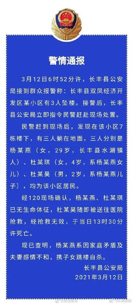 当地警方立刻赶赴现场处置。现已查明,杨某燕系因家庭矛盾及夫妻感情不和,携子女跳楼自杀。