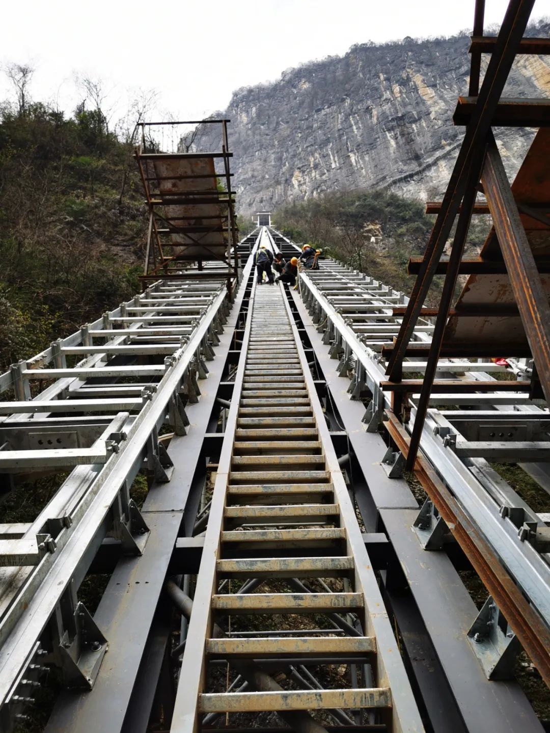 该斜行电梯离竣工还剩15天左右工期。电梯分为两条轨道,采用轿厢双线运输,每个轿厢可以容纳25人,完成一趟运送,仅需两分钟。项目建成后,电梯每天的运力达到3000人次左右。