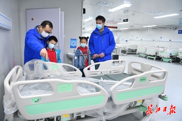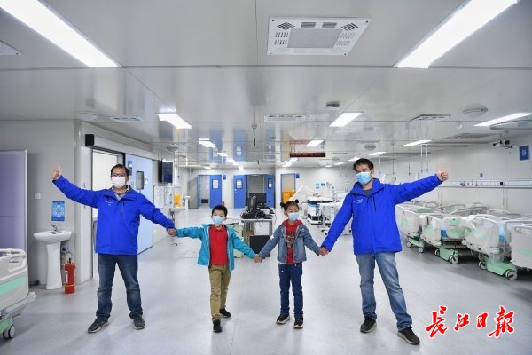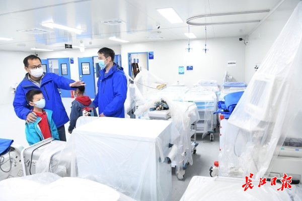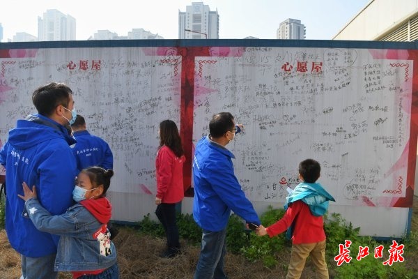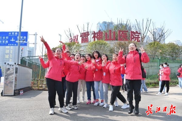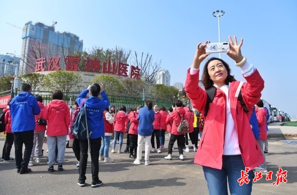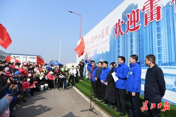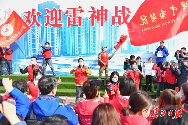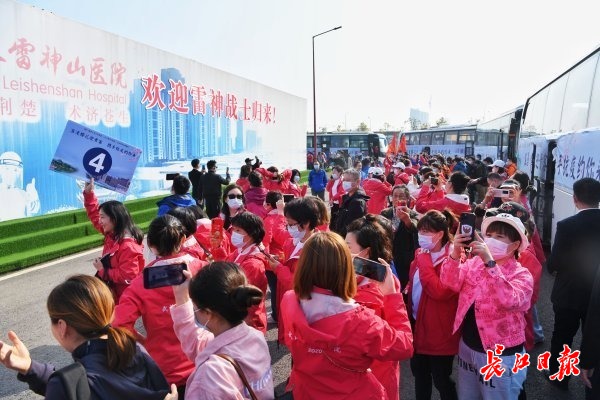 2021年3月14日,在武汉雷神山医院,去年曾经战斗过的援鄂医护人员携家属一起归来。欢迎仪式上,援鄂医护人员争相与雷神山医院院长王行环合影。