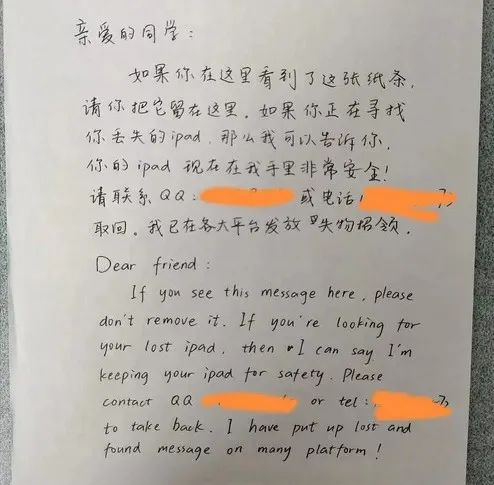 他发现iPad设置为全英文,且内置多款英语应用,因此判断失主可能是留学生。基于这一推测,他发布了中英文失物招领,并在捡到iPad的座位留下了纸条,写上了自己的电话和QQ号。