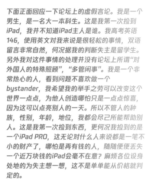 在一片指责声中,也有不少论坛用户表达了对拾取者行为的认可,在他们看来,这位学生发布双语启事只是出于热心。