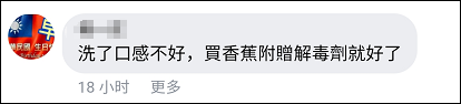 还有网友怀疑此举是否能洗得掉农药,一位网友甚至直接讽刺道,“洗了口感不好,卖香蕉附赠解毒剂就好了。”