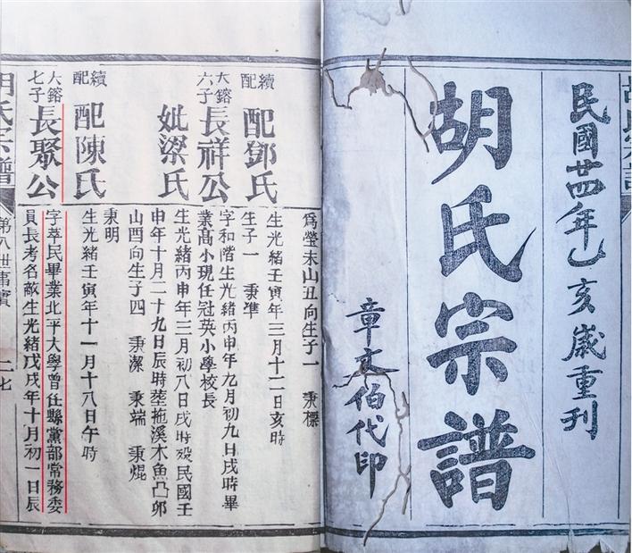 记载胡敌生平的民国二十四年版《胡氏宗谱》。胡敌,谱名长聚,字萃民。左图标示红线处为胡敌名录、生平。 (资料图片)