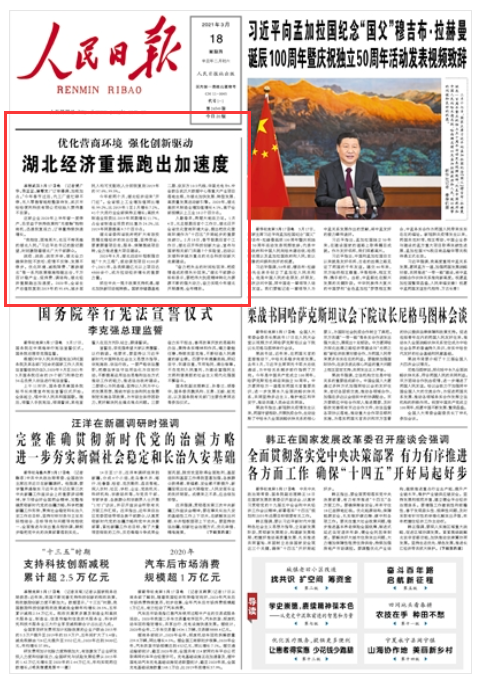 今天《人民日报》在头版头条刊发《优化营商环境 强化创新驱动 湖北经济重振跑出加速度》,聚焦湖北全力确保防控不放松、疫情不反弹、发展不停步,千方百计稳产业、促消费、调结构,把伟大抗疫精神转化为源源不断的强大动力。全文如下: