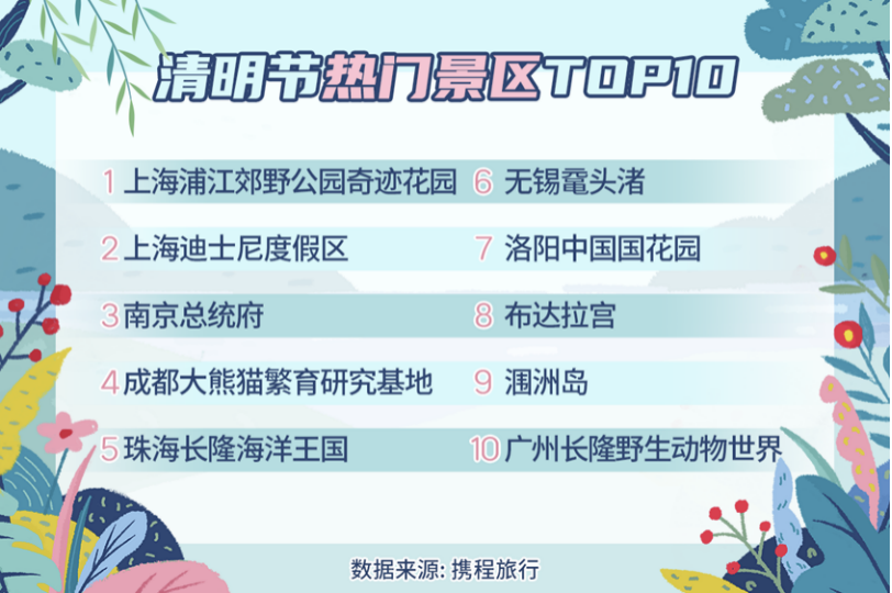 出游主题方面,花园花海、动植物园、城市公园、主题乐园、水族馆、博物馆、古镇是清明节最热门的几大景区类型。数据显示,上海浦江郊野公园奇迹花园、上海迪士尼度假区、南京总统府、成都大熊猫繁育研究基地等位列“清明节热门景区前十位”。