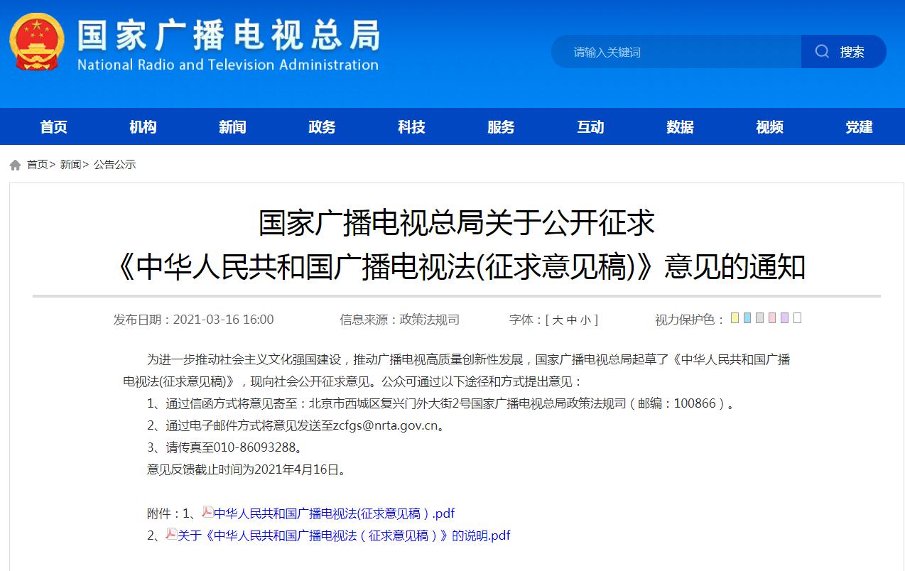 中新网北京3月18日电(记者 高凯)3月16日,国家广播电视总局公布《中华人民共和国广播电视法(征求意见稿)》(下称征求意见稿),向社会公开征求意见。